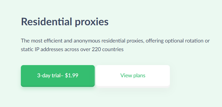 Unlike 911, Proxy-Seller employs a more ethical approach to acquiring residential proxies, which leads to better server uptime and performance. Users can manage their residential servers through a personal account, where a user can choose a country, region, city, and provider, then get a list of them with selected parameters. For $1.99, the provider also allows users to test the functionality of these residential proxies for 3 days.