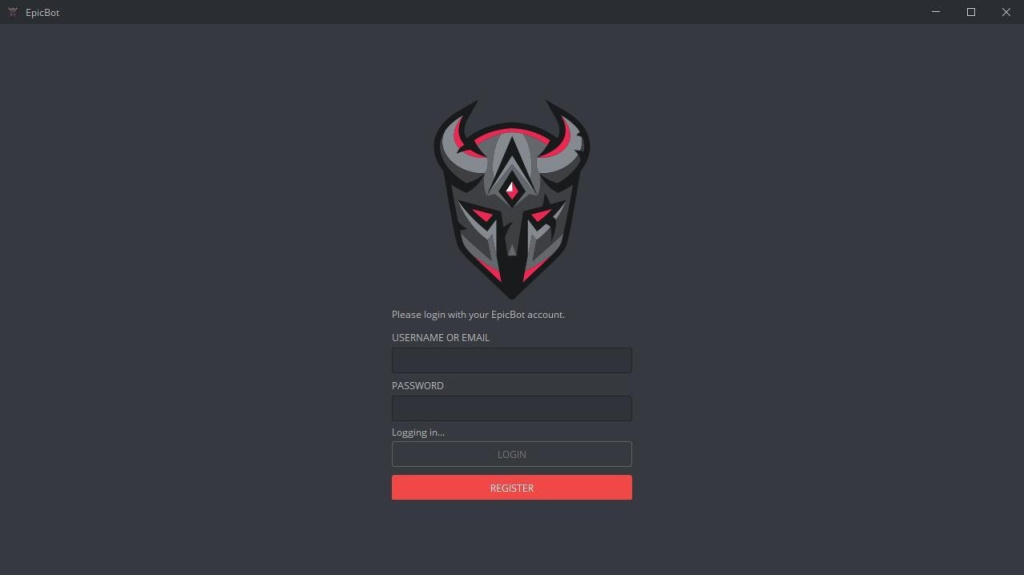 After hitting the Launch button, you will be asked to enter the username or email and password for your EpicBot account. If you don’t have one, click Register and create one.
